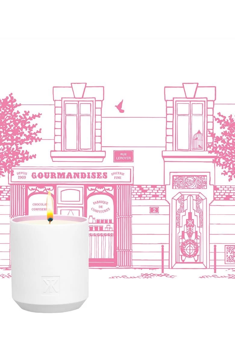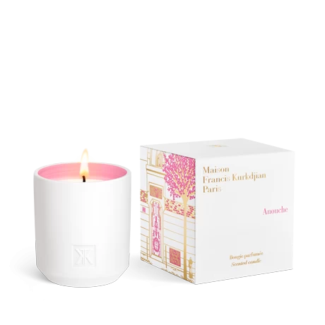 The candle diffuses a delicate scent intertwining nostalgia and sweet treats. Its releases a sweet aroma of rose petals and plums, smooth floral scents with a slightly spicy and honey note upheld with an armful of quince. This delicious candle rekindles childhood and innocence. The Anouche Maison Francis Kurkdjian scented candle is presented in a porcelain jar from Limoges where the inside color is applied by hand. The French plant and animal wax holds a braided cotton wick to preserve the candle’s olfactory quality and ensure an optimal 55-hour burn time.