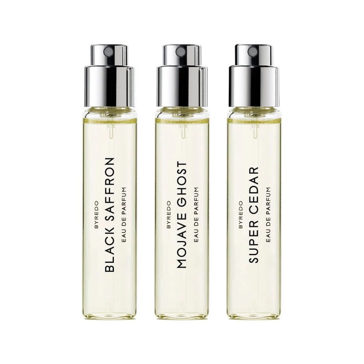 La Sélection Boisée is a presentation box of three woody iconic scents: Black Saffron, Mojave Ghost and Super Cedar, housed in 12ml vials, ideal to use with BYREDO’s functional and timeless “Nécessaire de Voyage” leather travel cases.