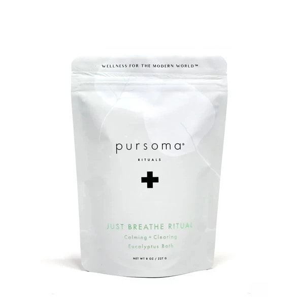 Pursoma Just Breathe Ritual is a therapeutic French Grey sea salt treatment infused with refreshing natural essential oils that open up the sinuses, boost the immune system, and bring you back to yourself. Eucalyptus is known for strengthening the immune system and unblocking the nasal passage. Rosemary, Lavender, and Ginger root protect and soothe. Leaves the skin soft, the body relaxed, and the mind energized.