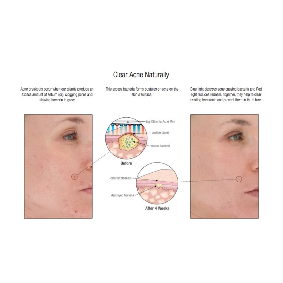 - Blue light destroys acne causing bacteria and Red light reduces redness, together, they help to clear existing breakouts and prevent them in the future.