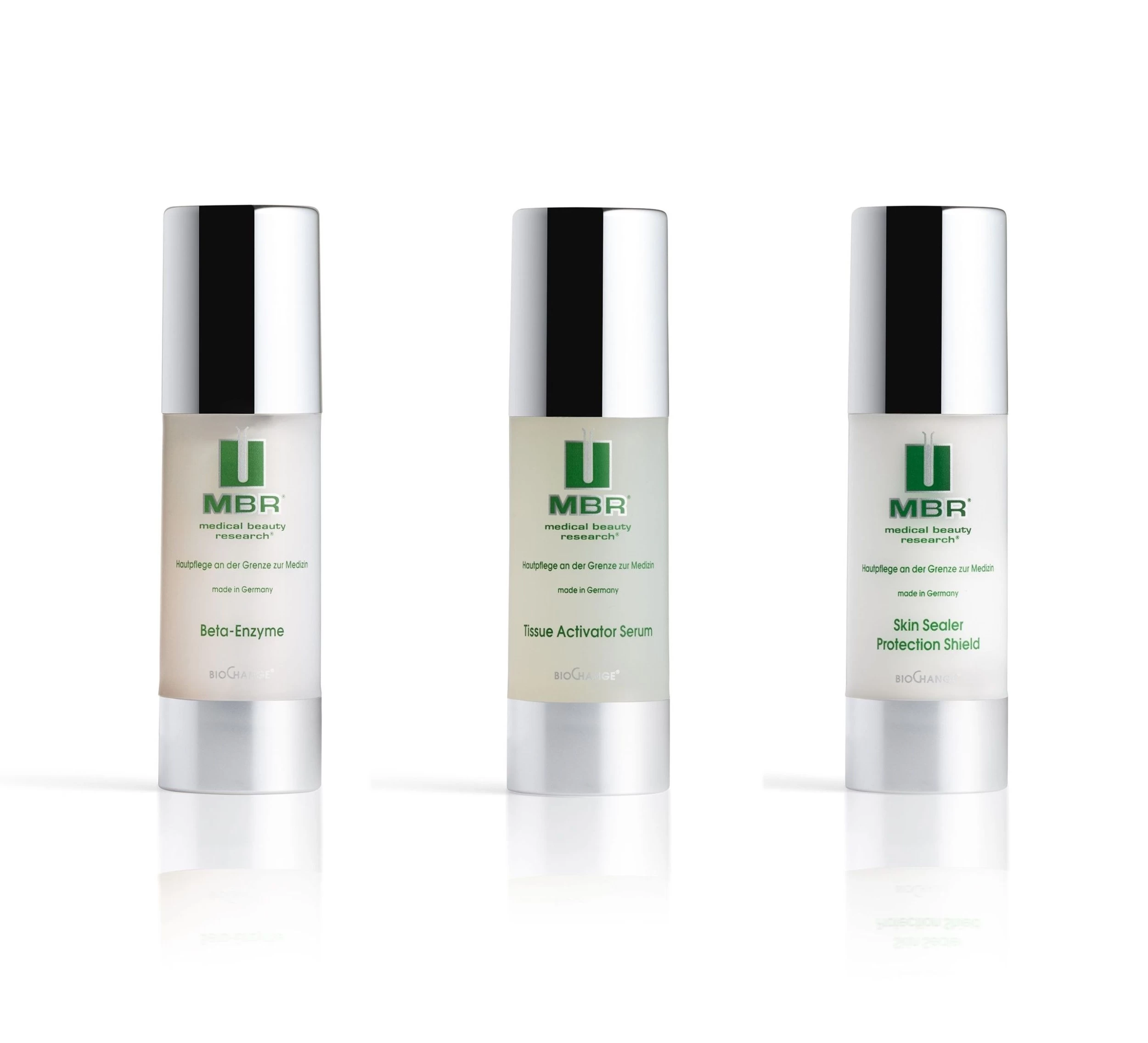 An essential collection of three effective BioChange products to experience a complete MBR regimen or as a perfect size for traveling. The collection contains 1x Beta Enzyme, 1x Tissue Activator Serum, 1x Skin Sealer Protection Shield.